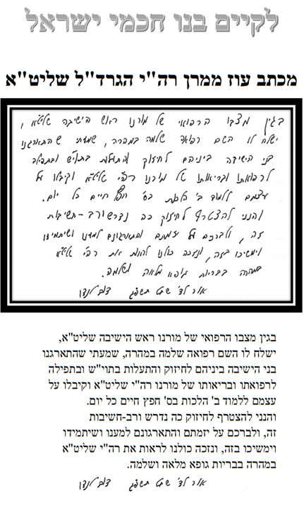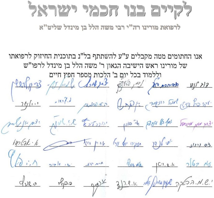 In a rare step, Rosh Yeshivah HaGaon HaRav Dov Landau also wrote a letter to the bnei yeshivah calling on them to take part in the initiative. HaRav Landau was also the first one to sign a committment to the chizzuk program initiated by the bochurim, and was joined by all the Rabbanim of the yeshivah.