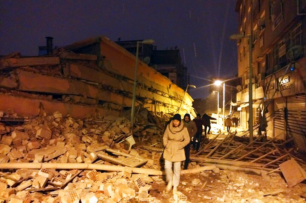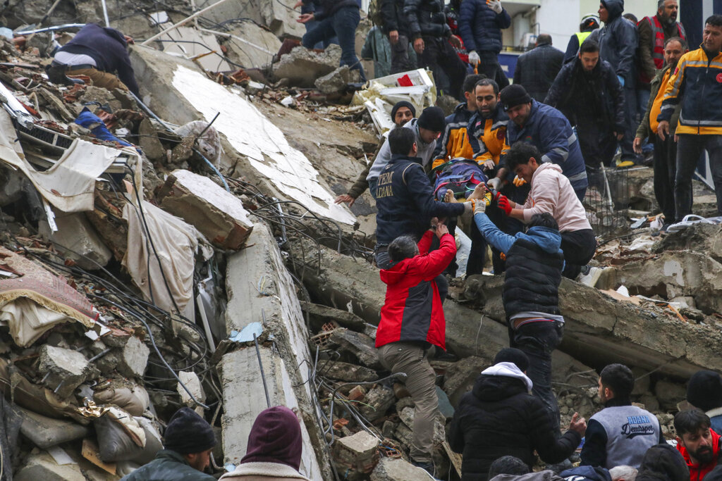 People try to reach trapped residents in a collapsed building in Pazarcik, in Kahramanmaras province, southern Turkey, early Monday, Feb. 6, 2023. A powerful earthquake has caused significant damage in southeast Turkey and Syria and many casualties are feared. Damage was reported across several Turkish provinces, and rescue teams were being sent from around the country. (Depo Photos via AP)A man searches collapsed buildings in Diyarbakir, southern Turkey, early Monday, Feb. 6, 2023. A powerful earthquake has caused significant damage in southeast Turkey and Syria and many casualties are feared. Damage was reported across several Turkish provinces, and rescue teams were being sent from around the country. (Depo Photos via AP)Rescue workers and medical teams try to reach trapped residents in a collapsed building following and earthquake in Diyarbakir, southeastern Turkey, early Monday, Feb. 6, 2023. A powerful earthquake has caused significant damage in southeast Turkey and Syria and many casualties are feared. Damage was reported across several Turkish provinces, and rescue teams were being sent from around the country. (AP Photo/Mahmut Bozarsan)A family who fled the war in Syria and live in Beirut, sit outside their home following an earthquake that hit neighboring Turkey early Monday, Feb. 6, 2023, in south of Beirut, Lebanon. Many residents in Lebanon left their homes and took to the streets or drove in their cars away from buildings. A powerful earthquake hit southeast Turkey and Syria early Monday, toppling buildings and sending panicked residents pouring outside in a cold winter night. (AP Photo/Hussein Malla)Rescue teams try to reach trapped residents inside collapsed buildings in Adana, Turkey, Monday, Feb. 6, 2023. A powerful quake has knocked down multiple buildings in southeast Turkey and Syria and many casualties are feared. (IHA agency via AP)People and rescue teams try to reach trapped residents inside collapsed buildings in Adana, Turkey, Monday, Feb. 6, 2023. A powerful quake has knocked down multiple buildings in southeast Turkey and Syria and many casualties are feared. (IHA agency via AP)A Syrian man carries a dead young girl, in Azmarin town, in Idlib province north Syria, Monday, Feb. 6, 2023. A powerful earthquake hit southeast Turkey and Syria early Monday, toppling buildings and sending panicked residents pouring outside in a cold winter night. (AP Photo/Ghaith Alsayed)Syrian citizen search through the wreckage of a collapsed building, in Azmarin town, in Idlib province north Syria, Monday, Feb. 6, 2023. A powerful earthquake hit southeast Turkey and Syria early Monday, toppling buildings and sending panicked residents pouring outside in a cold winter night. (AP Photo/Ghaith Alsayed)People walk next to buildings destroyed by an earthquake in Malatya, Turkey, Monday, Feb. 6, 2023. A powerful quake has knocked down multiple buildings in southeast Turkey and Syria and many casualties are feared. (DIA images via AP)People walk next to a mosque destroyed by an earthquake in Malatya, Turkey, Monday, Feb. 6, 2023. A powerful quake has knocked down multiple buildings in southeast Turkey and Syria and many casualties are feared. (DIA images via AP)People and emergency teams rescue a person on a stretcher from a collapsed building in Adana, Turkey, Monday, Feb. 6, 2023. A powerful quake has knocked down multiple buildings in southeast Turkey and Syria and many casualties are feared. (IHA agency via AP)People and emergency teams rescue a person on a stretcher from a collapsed building in Adana, Turkey, Monday, Feb. 6, 2023. A powerful quake has knocked down multiple buildings in southeast Turkey and Syria and many casualties are feared. (IHA agency via AP)Syrian civil defense members search for people under the rubble of a destroyed building in Afrin, Syria, Monday, Feb. 6, 2023. A powerful earthquake hit southeast Turkey and Syria early Monday, toppling buildings and sending panicked residents pouring outside in a cold winter night. (Zana Halil/DIA images via AP)People carry a man injured in an earthquake into the al-Rahma Hospital in the town of Darkush, Idlib province, northern Syria, Monday, Feb. 6, 2023. A powerful earthquake has caused significant damage in southeast Turkey and Syria and many casualties are feared. Damage was reported across several Turkish provinces, and rescue teams were being sent from around the country. (AP Photo/Ghaith Alsayed)