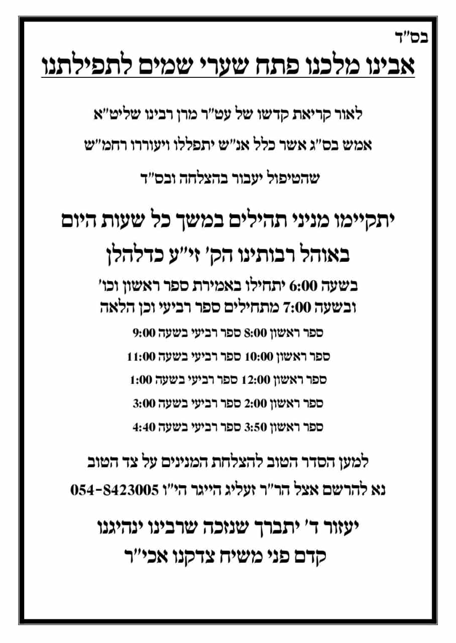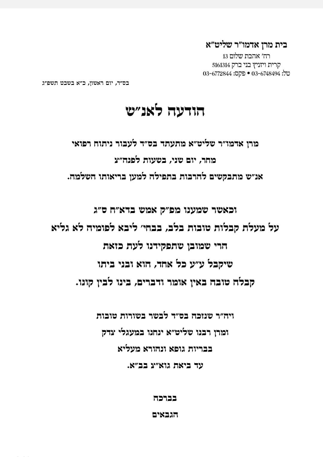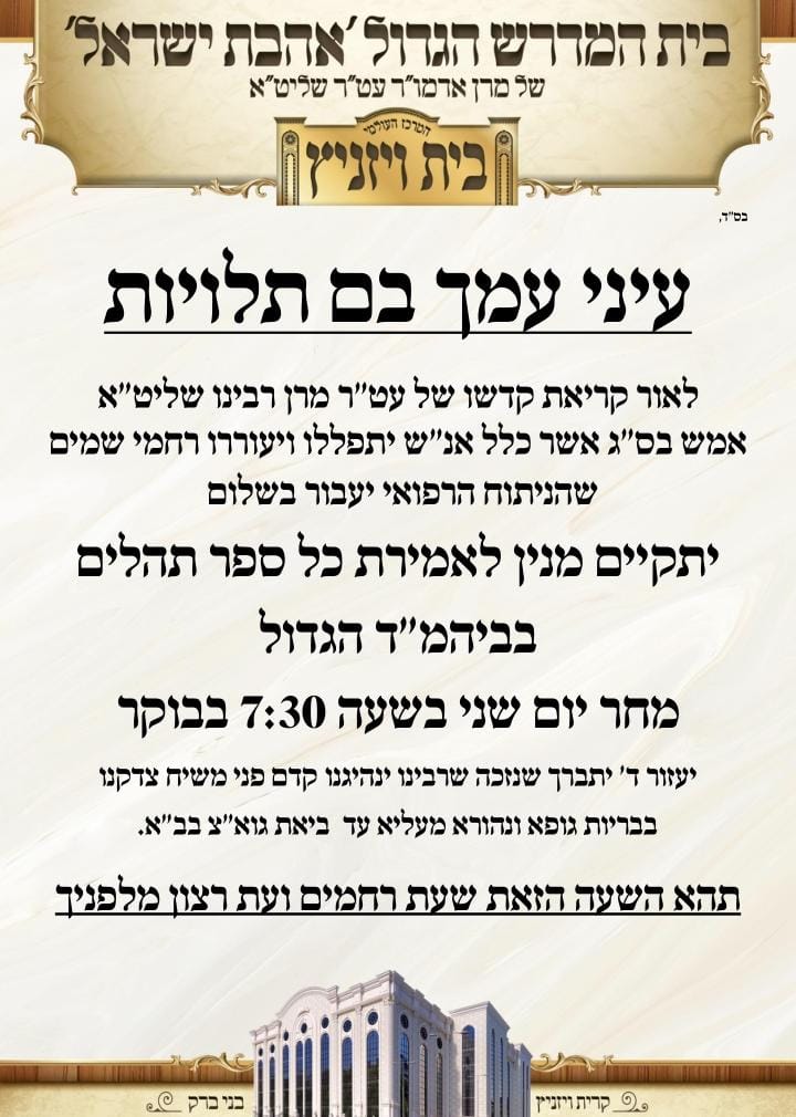 A statement from the Chassidus said that “thousands of chassidei Vizhnitz, together with Klal Yisrael, are davening for the refuah of Rebbe Yisrael ben Leah Esther l’refuah sheleimah b’toch shaar cholei Yisrael.
