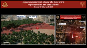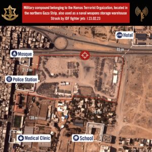 The IDF spokesperson said: “IAF fighter jets struck both a weapons manufacturing site and military compound belonging to the Hamas terrorist organization, located in central and northern Gaza. The compound is located adjacent to a mosque, medical clinic, hotel, police station and school.”