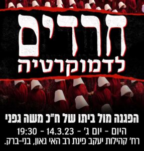 At the demand of the police, the location of the protest was changed from outside Gafni’s home to a few hundred meters away. When the protesters arrived at the area, they were greeted with shouts by Bnei Brak residents who had gathered in the area, who yelled at them “traitorous leftists!” and “Only Bibi is the king of Israel.”