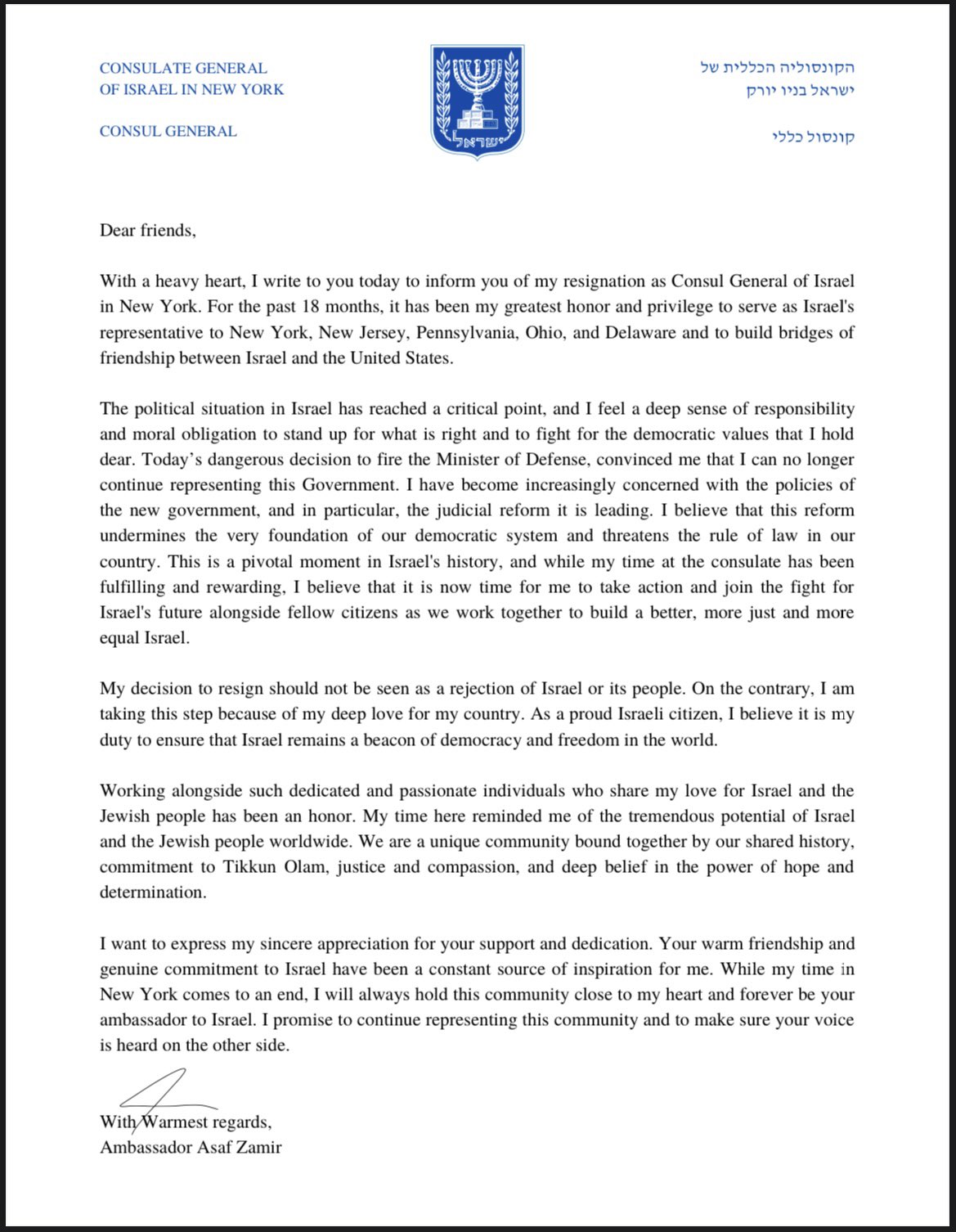 The past 18 months as Israel’s Consul General in New York were fulfilling and rewarding, but following today’s developments, it is now time for me to join the fight for Israel's future to ensure it remains a beacon of democracy and freedom in the world. Here is the letter I sent: pic.twitter.com/Sfz8y3ALLv