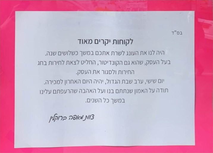According to a B’Chadrei Chareidim report, the closure is due to the fact that the owner is retiring and closing his factory in Givat Shaul as well as the store in Mea Shearim.