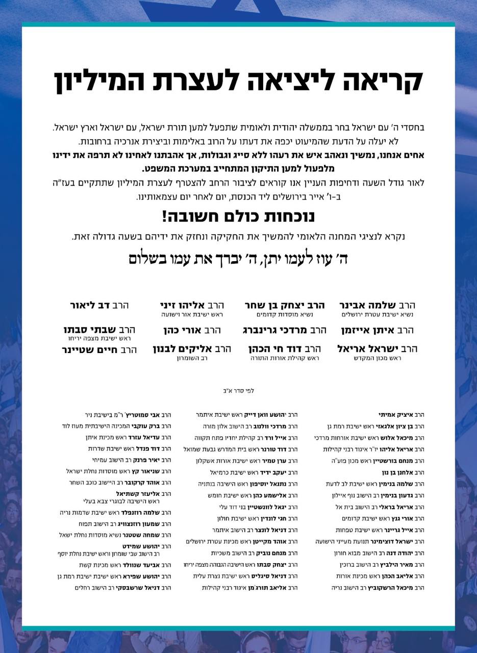 “In light of the magnitude of the hour and the urgency of the matter, we call on the general public to join the million-man rally that will be held on Vav Iyar in Jerusalem near the Knesset, the day after our Yom Ha’atzmaut. Everyone’s presence is important! We call on the representatives of the national camp to continue the legislation and we support their efforts at this important time.”