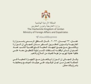 The Jordanian Ministry of Foreign Affairs published a notice officially confirming the arrest of Adwan, stating: “We are following up with all the relevant bodies on the issue of the arrest of the member of parliament Imad Al-Adwan who was arrested by the Israeli authorities on the charge of arms and gold smuggling. The Ministry of Foreign Affairs, in cooperation with the relevant bodies in the Kingdom, is working to address the issue as soon as possible.”
