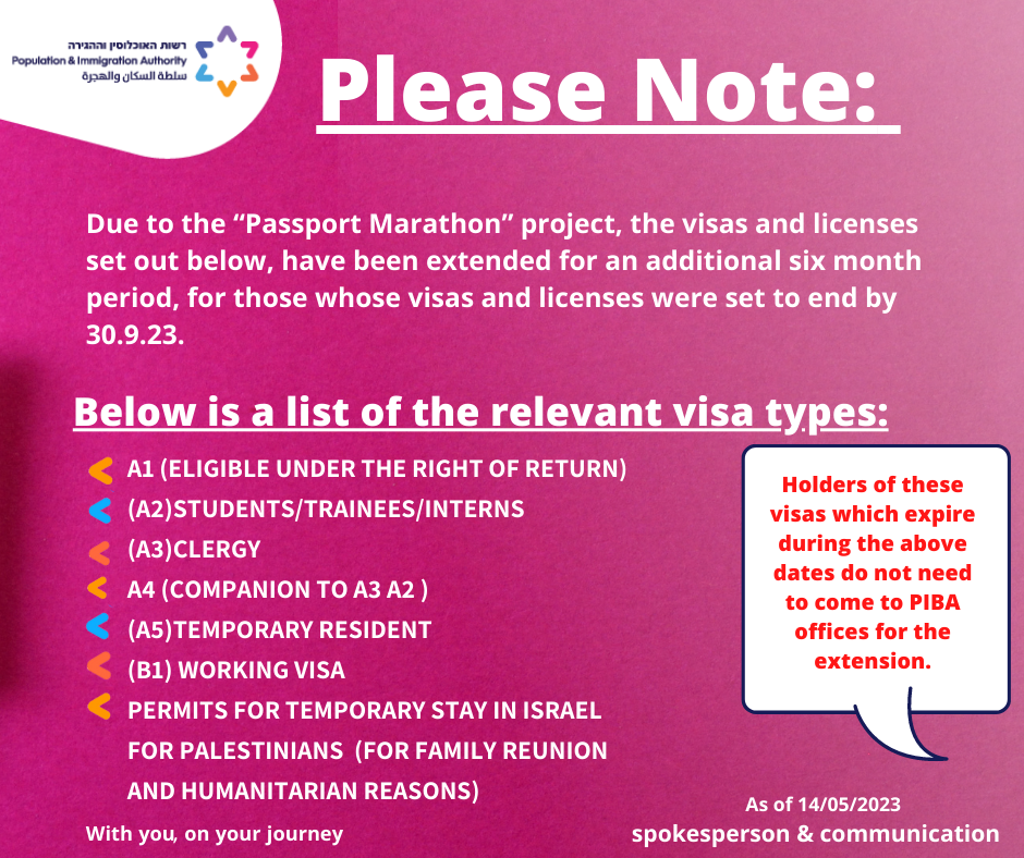 However, the Misrad HaPnim announcement does not specify a start date from when one’s visas must have expired in order to be included in this extension. Chaim V’Chessed has learned that, disappointingly, only those visas which expired from May 14 and on are included in the extension. Hence, people whose visas expired in recent months, but who did not have an opportunity to renew their visas for whatever reason, will not benefit from the extension.