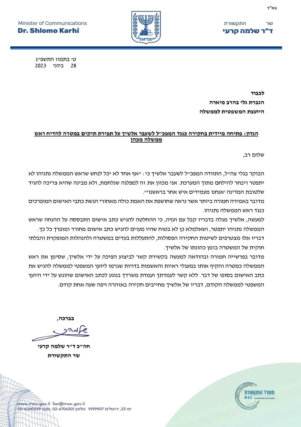 Likud MK Shomo Karhi, who is a lawyer by profession, already sent a letter to Attorney-General Gali Baharav-Miara demanding the opening of an immediate investigation against former Police Commissioner Roni Alsheich for fabricating criminal cases with the goal of removing the ruling prime minister.