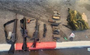 After the soldiers eliminated the terrorists, they searched the car and found three M-16 weapons, a pistol, cartridges, and military equipment.