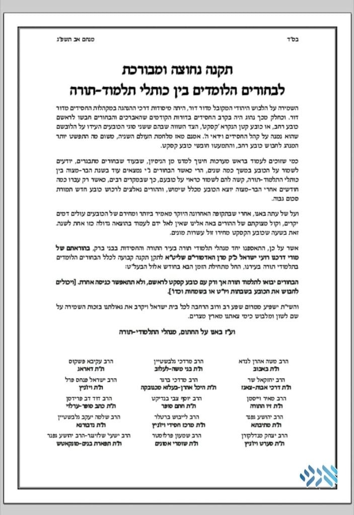 The letter, entitled: Necessary And Welcome Regulation, signed by principals of Talmudei Torah of a number of chassidish groups, states: “The shemirah of accepted Jewish levush from generation to generation is one of the foundations of chassidish groups. As part of it, it was customary to wear a small hat or kashket, and for some reason since World War II the custom of wearing a wide hat has spread and the number of kashket wearers has decreased.”
