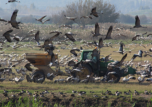 The Hula Valley in northern Israel is one of the world’s busiest migration flyaways, with over 500 million birds from 550 species flying over Israel twice a year. The main migratory season is in the fall, with huge flocks of pelicans, herons, storks, cranes, and other species arriving at the valley, resting on their flights between Europe and Africa.