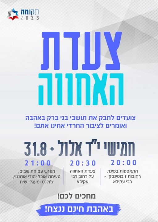 The “March of Brotherhood,” organized by the pro-judicial reform T’kuma 2023 headquarters, is scheduled to take place this Thursday evening on Rechov Rabbi Akiva.