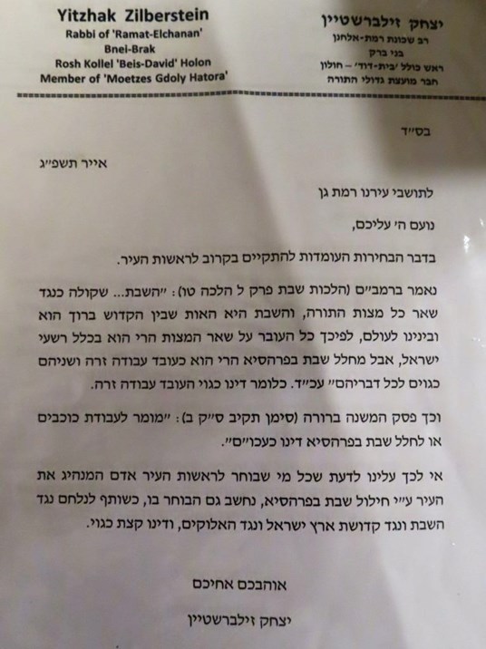 In May, HaRav Zilberstein published a letter to the residents of Ramat Gan saying that everyone should know that anyone who votes for a mayor who will lead the city through public Chillul Shabbos is considered as choosing to be a partner in fighting against Shabbos and kedushas Eretz Yisrael and against Hashem, chalilah.