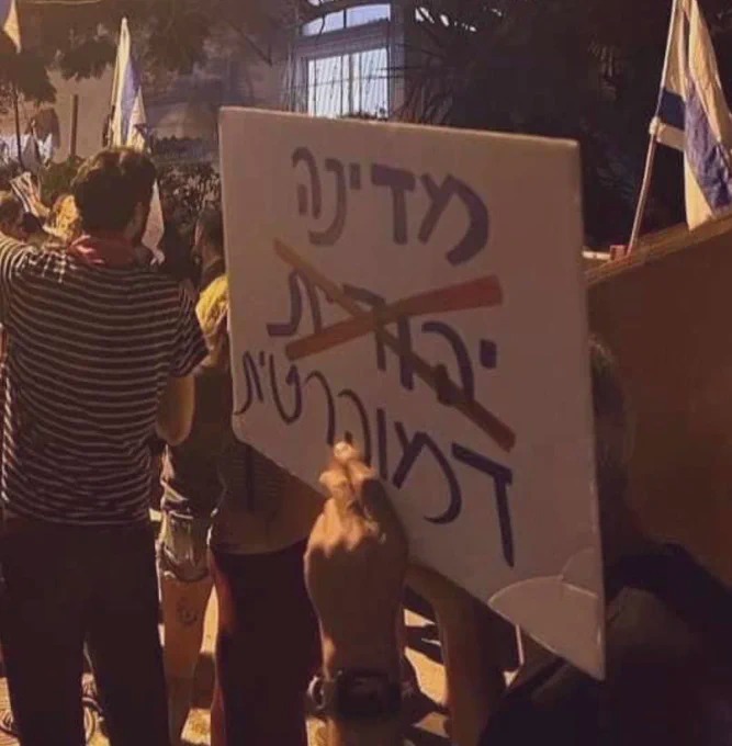 Right-wing activist Menny Asyag posted a photo of a sign the protesters held that read A Jewish Democratic State. He wrote; “This is the entire truth of the protests and their ultimate goal. We’ll never allow them to win! Never!”