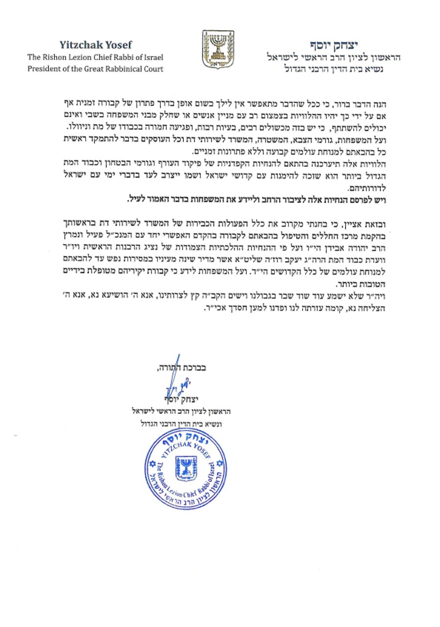 HaRav Yosef responded: “The matter is clear that as much as possible, the solution of temporary kevurah should not be used, even if it means that the levayos will be held with just a minyan of people or if some of the family members are in captivity and cannot participate – because there are many obstacles, many problems, and serious harm to the kavod of the meis.”