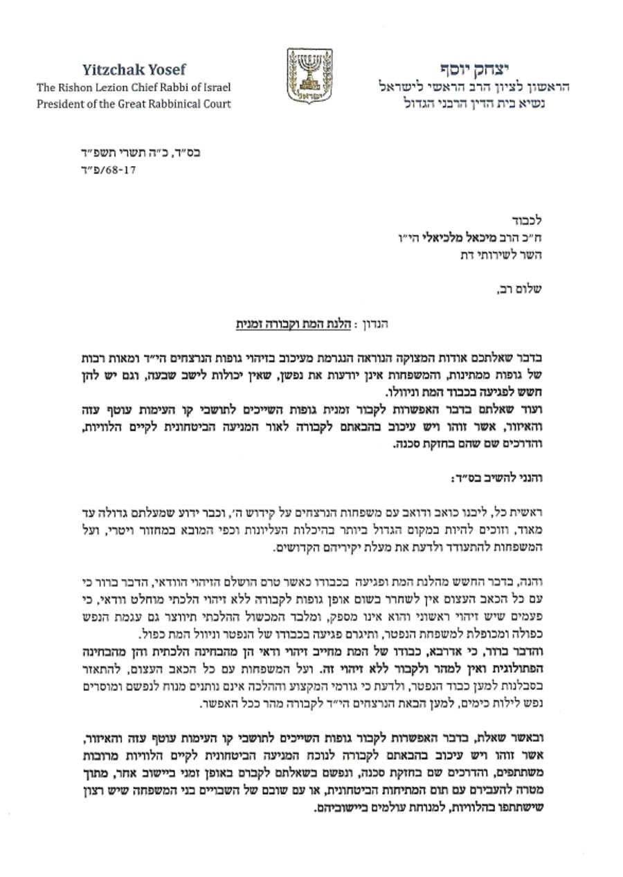 HaRav Yosef responded: “The matter is clear that despite the immense pain, bodies should under no circumstances be released for kevurah without complete and definite identification. Adarabah, k’vodo shel hameis requires definite identification both from a halachic viewpoint – due to the fear of aginus – and from a pathological viewpoint, and one should not rush and bring to kevurah without this identification.”
