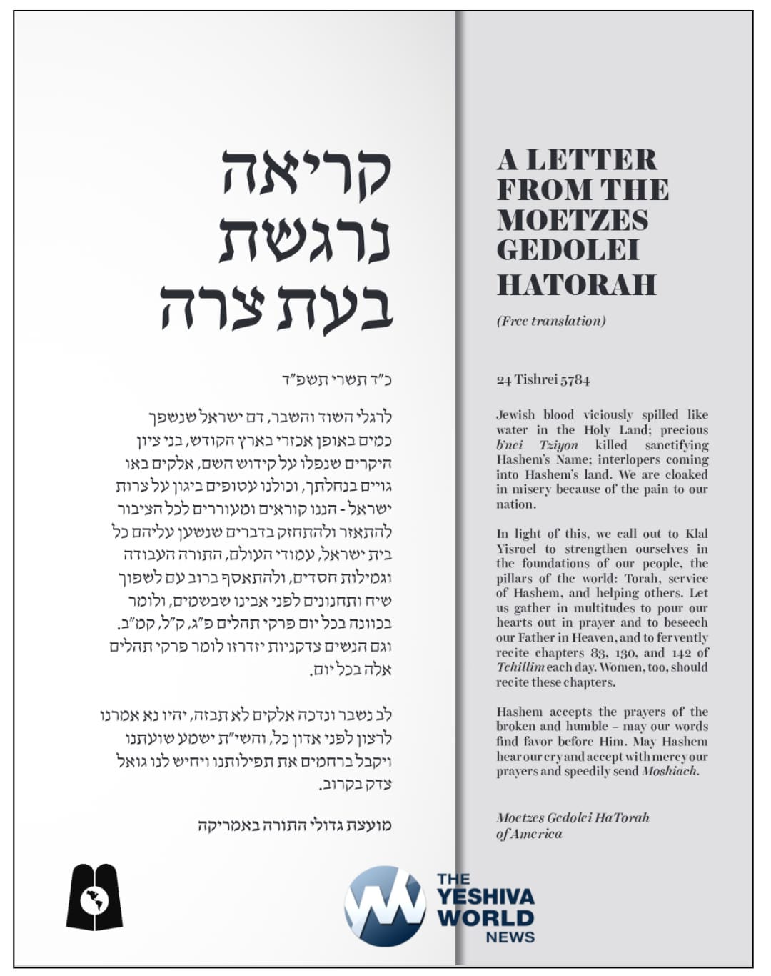 In light of this, we call out to Klal Yisroel to strengthen ourselves in the foundations of our people, the pillars of the world: Torah, service of Hashem, and helping others. Let us gather in multitudes to pour our hearts out in prayer and to beseech our Father in Heaven, and to fervently recite chapters 83, 130, and 142 of Tehillim each day. Women, too, should recite these chapters.