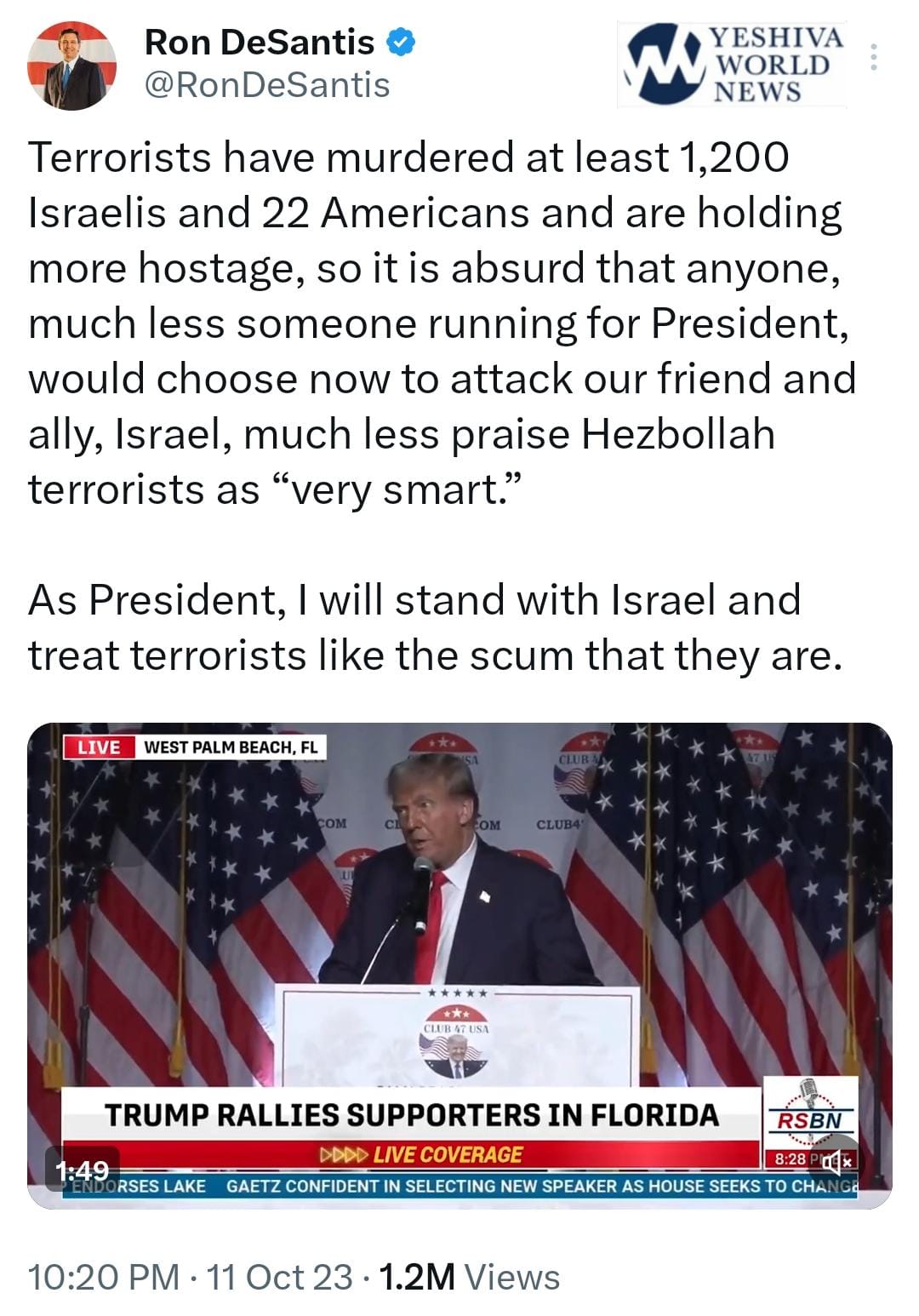 Former president and current Republican presidential frontrunner Donald Trump made his first public comments about the recent heinous Hamas attacks on Israel that have killed more than 1,200, including 25 Americans – and the comments weren’t pretty. Stunningly, the ex-prez thought it would be appropriate to both praise Hezbollah and attack Israel over the atrocities.