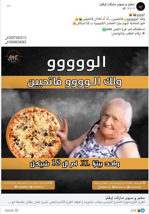 The ad, shared by the pizza shop on Facebook, shows an elderly Israeli woman being held captive in Gaza next to one of their pizza pies and urging people to come buy them.