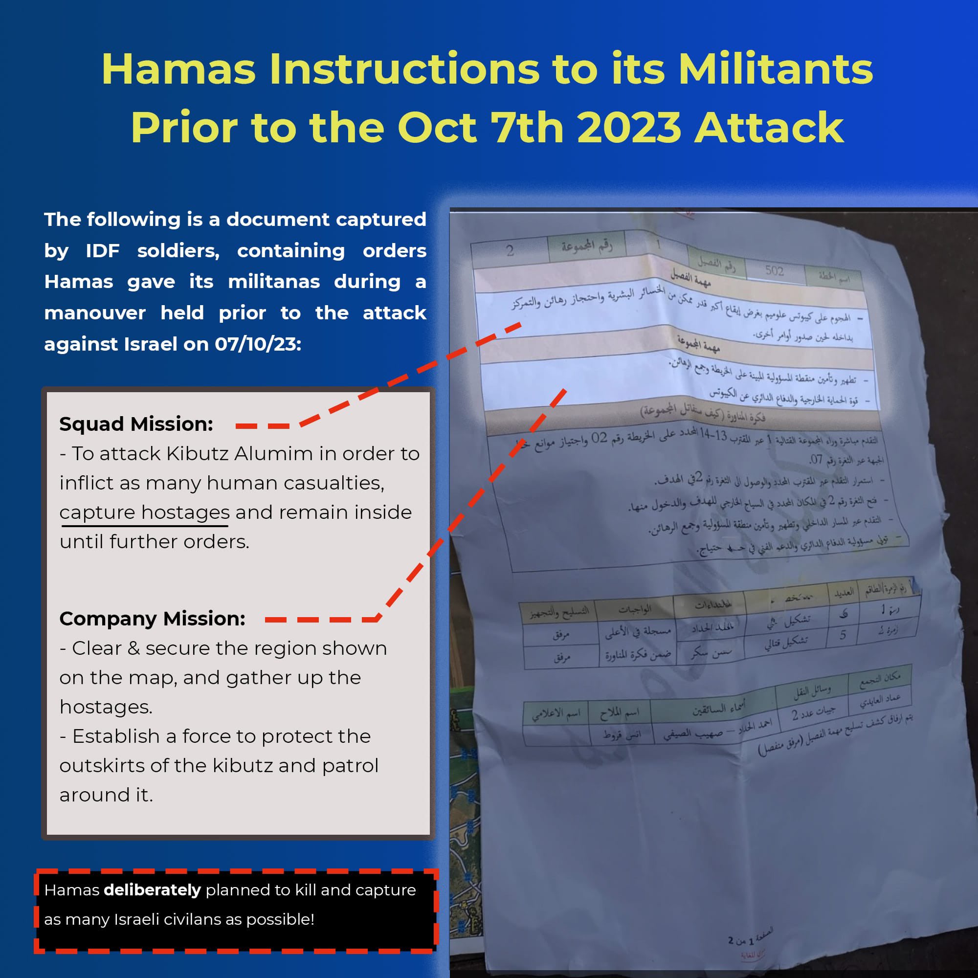 “This was found on the body of one of the terrorists, this booklet is an instruction guide, how to go into a civilian premises, into a kibbutz, a city, a moshav, how to break in. And first thing what do you do when you find the citizens – you torture them. This is the booklet – it says exactly how to torture them, how to abduct them, how to kidnap them.”
