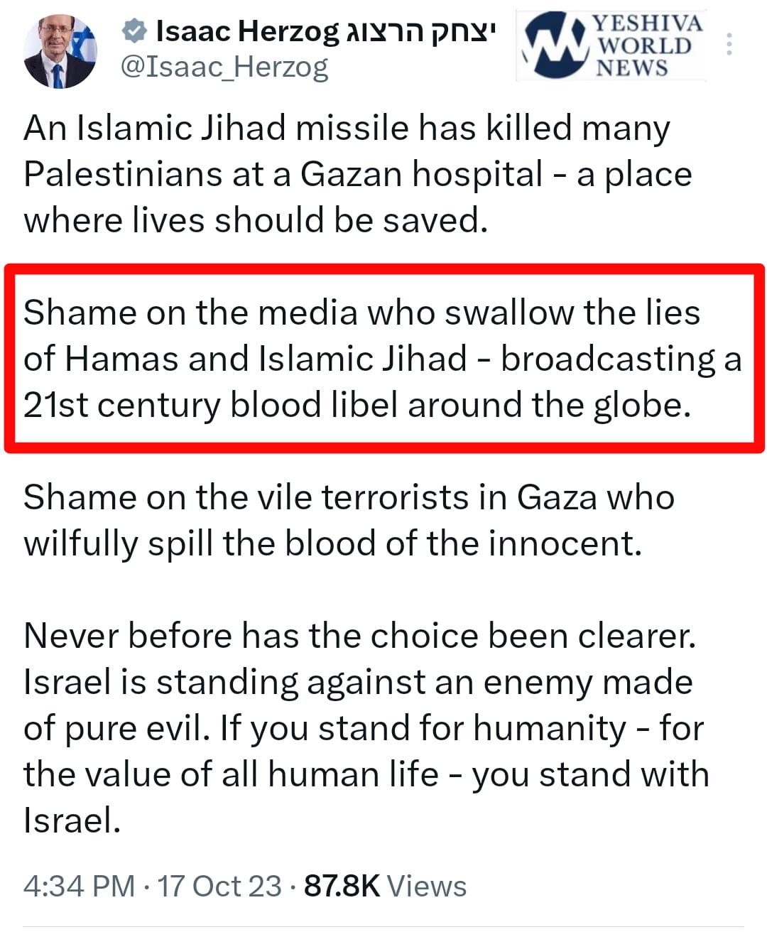 In a tweet, he points out that it was an Islamic Jihad missile that caused casualties at a Gazan hospital, emphasizing that hospitals should be places where lives are saved. Herzog also criticizes the media for spreading what he calls a “21st-century blood libel” by accepting the claims of Hamas and Islamic Jihad.