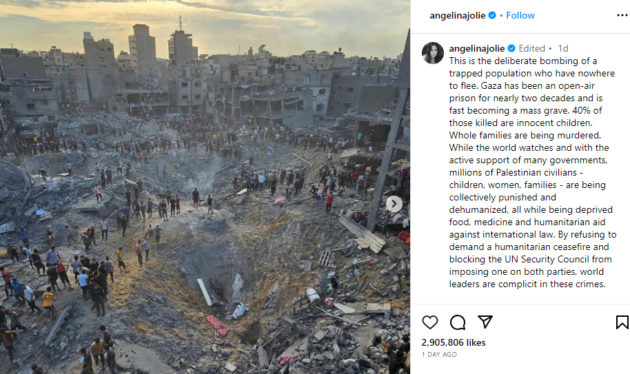 We are referring to Angelina Jolie, who has made Instagram posts attacking Israel for its efforts to eradicate Hamas following the brutal slaughter of more than 1,400 of its citizens – almost all of them civilians – in a historically evil attack.