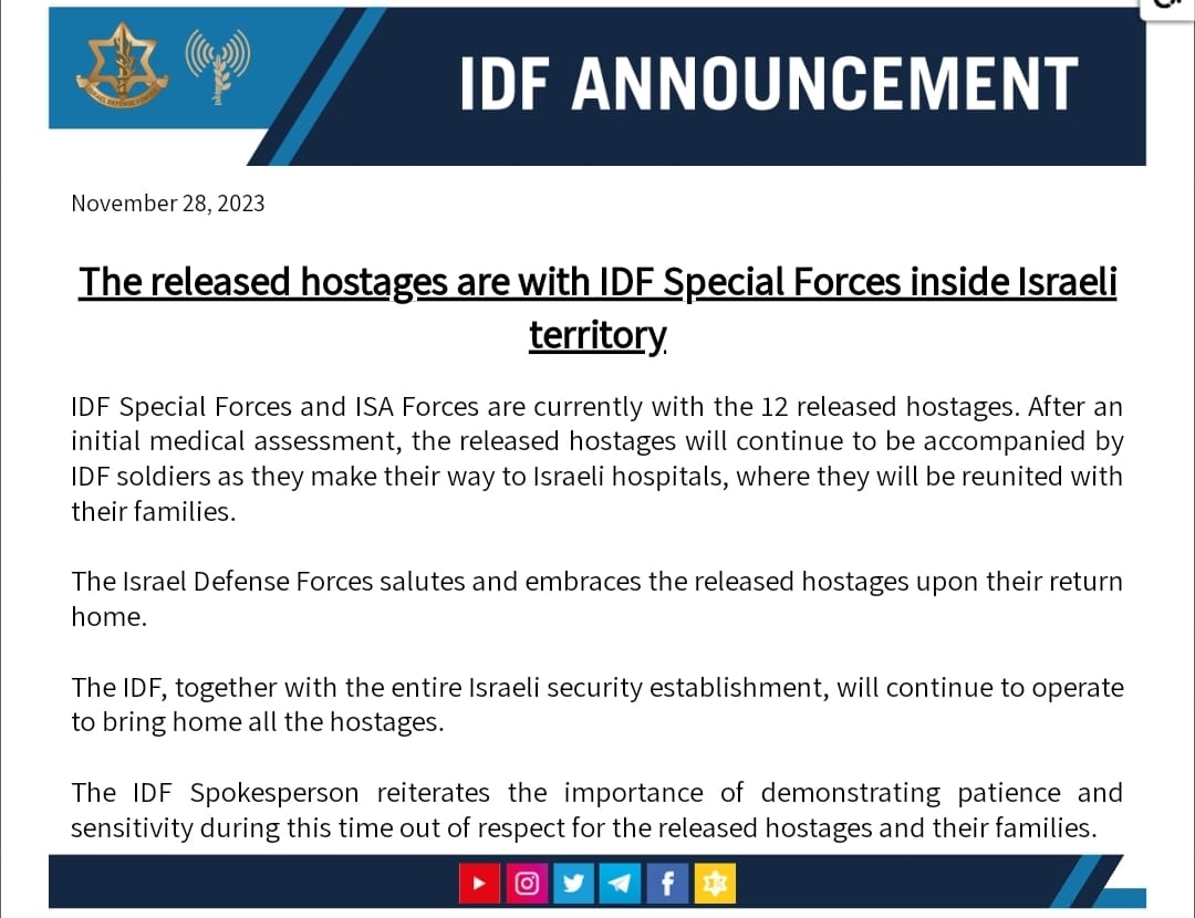 Red Cross representatives transferred the 12 hostages over to IDF special forces adjacent to the border fence in the central Gaza Strip. From there, they made their way to the Hatzerim Base.