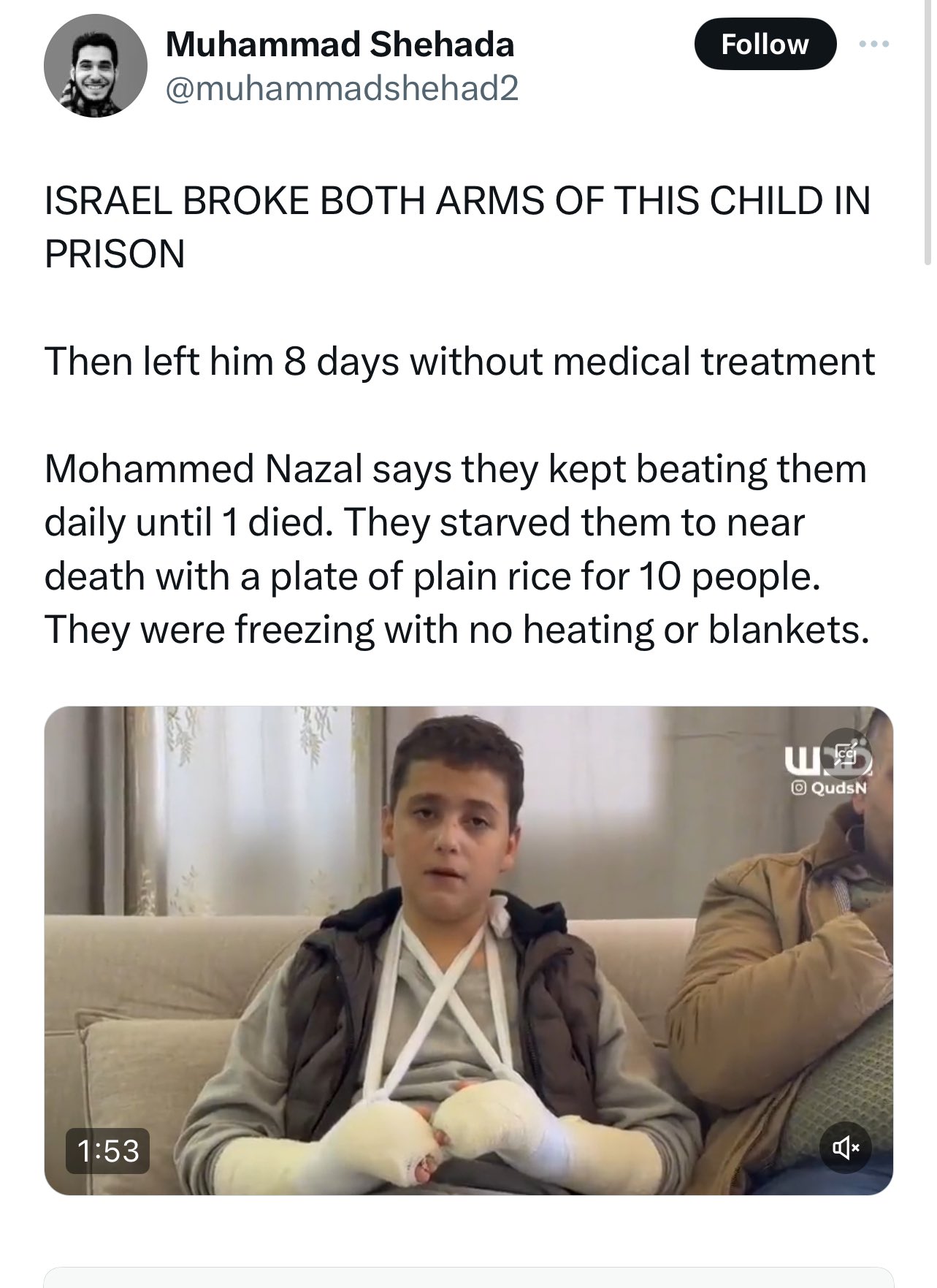 He is seen on a number of scripted propaganda videos with both arms in slings, claiming that prison guards beat him with hammers, breaking both his arms, and then left him in excruciating pain for eight days without any medical treatment.