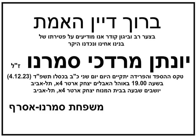 After 58 days of uncertainty, the family of Yonatan Samarno, H’yd, 21, of Tel Aviv was informed that he was murdered by Hamas terrorists while in captivity in Gaza.