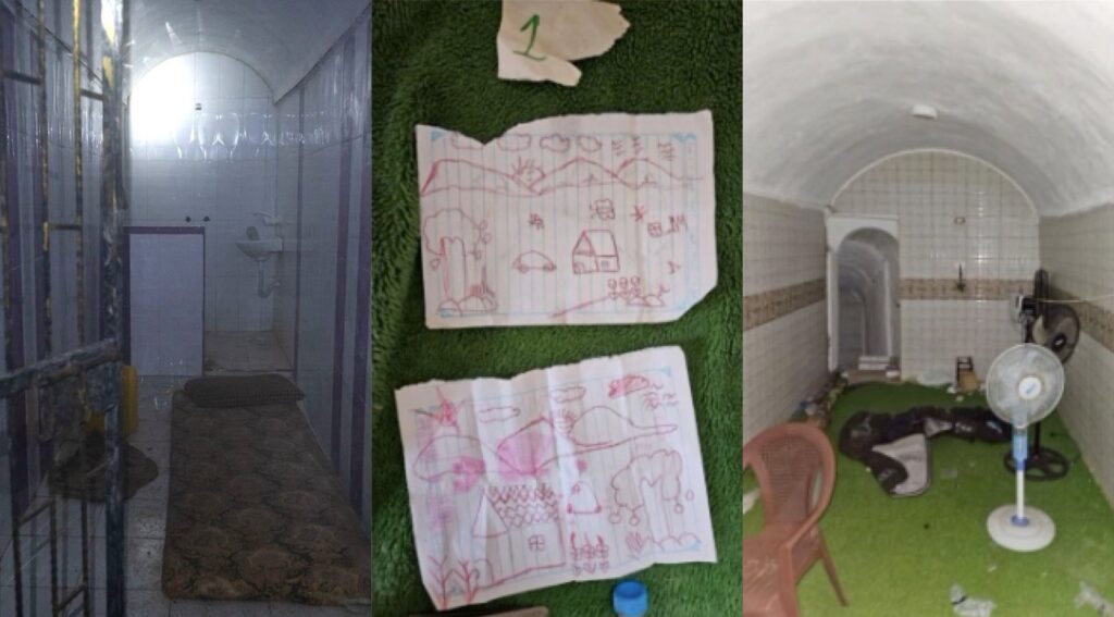 “We found evidence indicating the presence of hostages, including drawings made by Emilia Aloni, 5, along with other hostages. Further down the tunnel, we found five narrow barred prison cells, each with a toilet and mattress.”