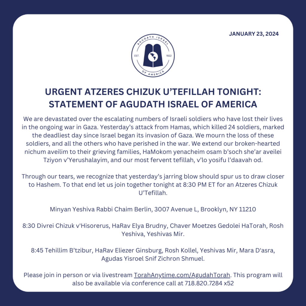 Through our tears, we recognize that yesterday’s jarring blow should spur us to draw closer to Hashem. To that end let us join together tonight at 8:30 PM ET for an Atzeres Chizuk U’Tefillah.