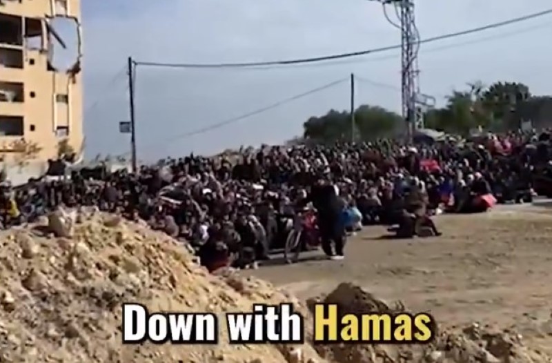 A video shared online shows hundreds of Gazans evacuating to a secure humanitarian area while chanting “Down with Hamas.”
