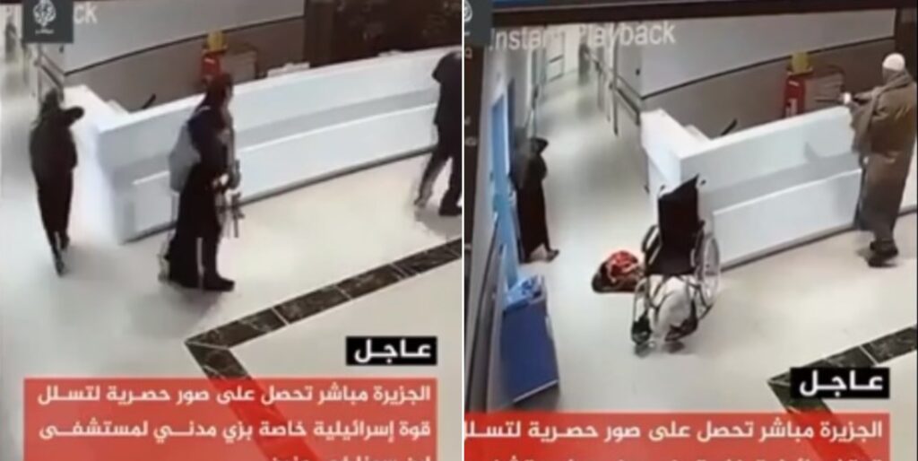 The footage shows four undercover Israeli operatives entering the hospital disguised as a Palestinian family, with three family members, one woman and two men, hovering over a “patient” in a wheelchair.