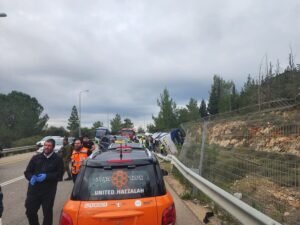 MDA paramedic Yisrael Cohen said: “A large number of responders quickly arrived at the scene with ambulances and mobile ICU units. It was a neis that the bus was not full. The bus driver and the passengers, who were lightly injured, exited from the rear window. The driver of the private car suffered injuries to his limbs and abdomen and was evacuated to the hospital in moderate condition.”