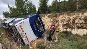 A bus on the way from Beitar Illit to Beis Shemesh was involved in an accident on Wednesday morning next to Mevo Beitar on Highway 375, causing it to veer into a ditch on the side of the road and overturn on its side.