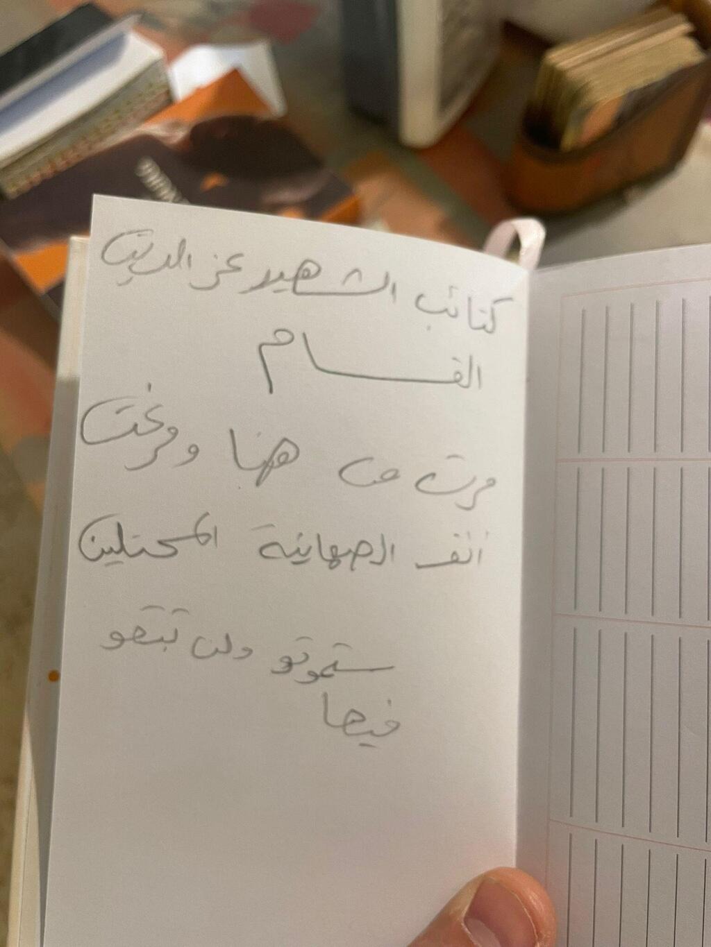 “We found the day planner on a table in the living room,” he told Ynet. “It’s a diary where she wrote all sorts of things she needed to remember. I took a picture and sent it to Arabic-speaking friends to translate for me. Their message doesn’t intimidate us. My grandfather and grandmother founded the kibbutz, and this place is theirs and ours. It only teaches us who these murderers are and what our response should be.”