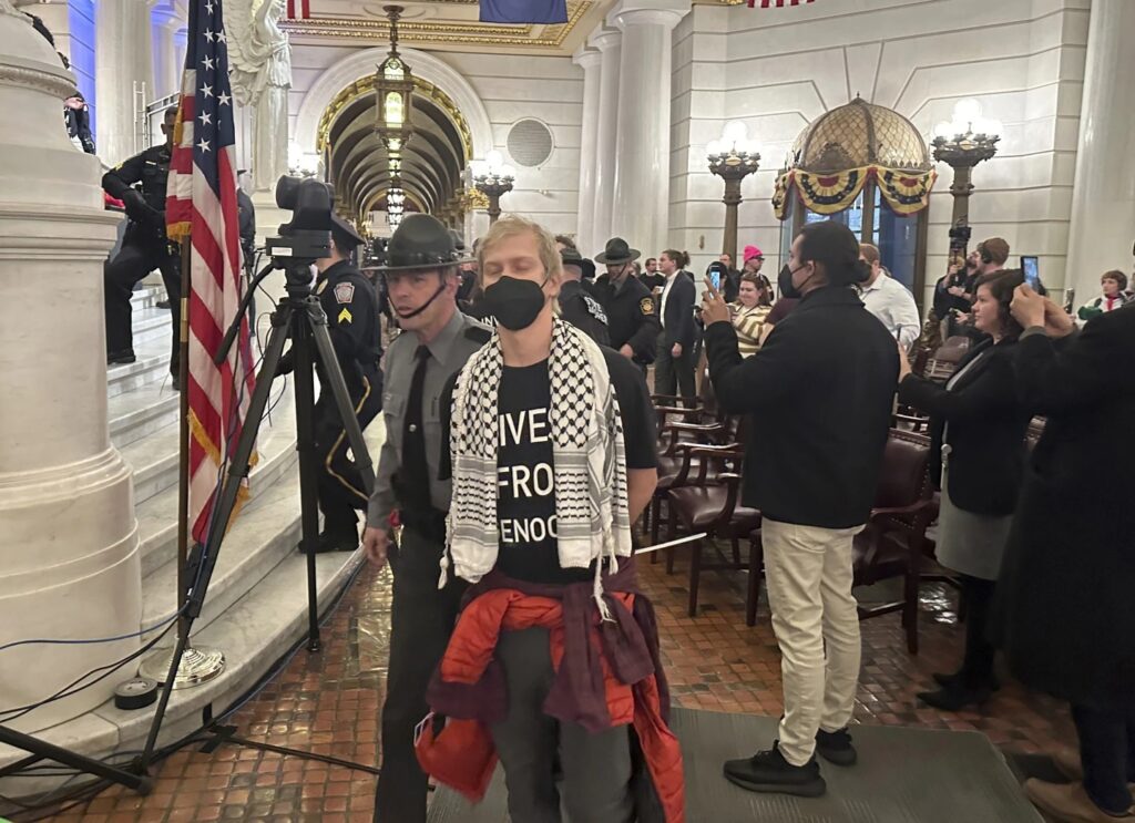 The event was organized by Jewish Voice for Peace, the Philly Palestine Coalition and the Pennsylvania Council on American-Islamic Relations. It began Monday morning outside the Capitol but moved to the Rotunda by early afternoon.