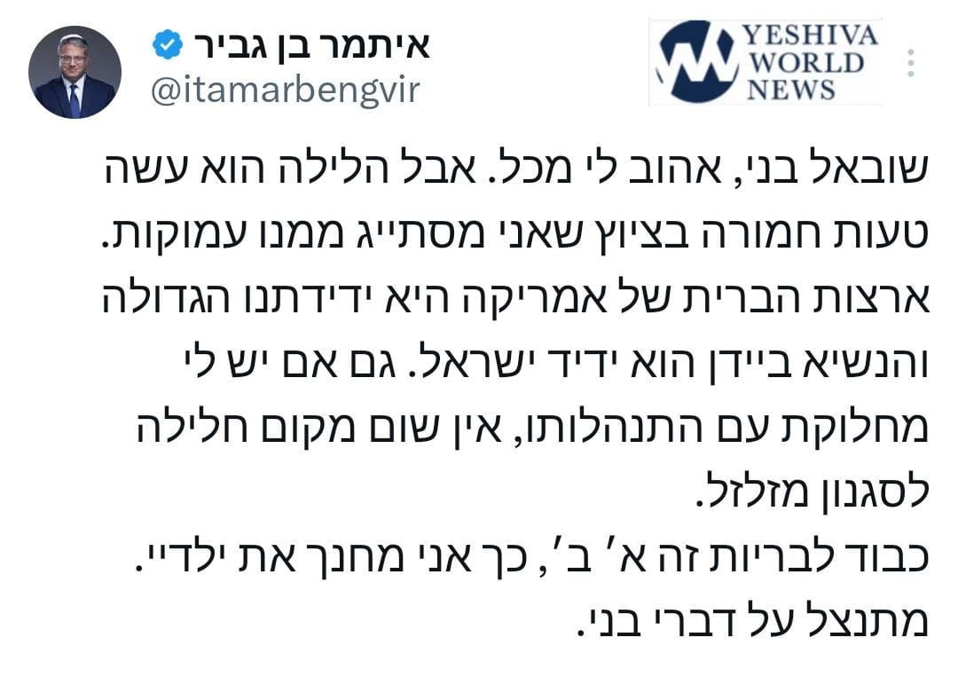 The tweet immediately caused a backlash, prompting Itamar Ben Gvir to issue an apology for his son’s “serious mistake” and to express his disapproval of the tweet. “The United States of America is our great friend and President Biden is a friend of Israel,” the minister wrote. “I apologize for my son’s words,” he added.