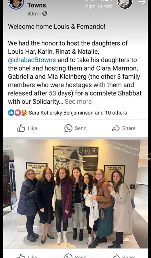She wrote in a Facebook post: “A week ago, Louis Har’s daughter and her husband were at the Ohel (of the Lubavitcher Rebbe in Brooklyn] and davened for his immediate release.”