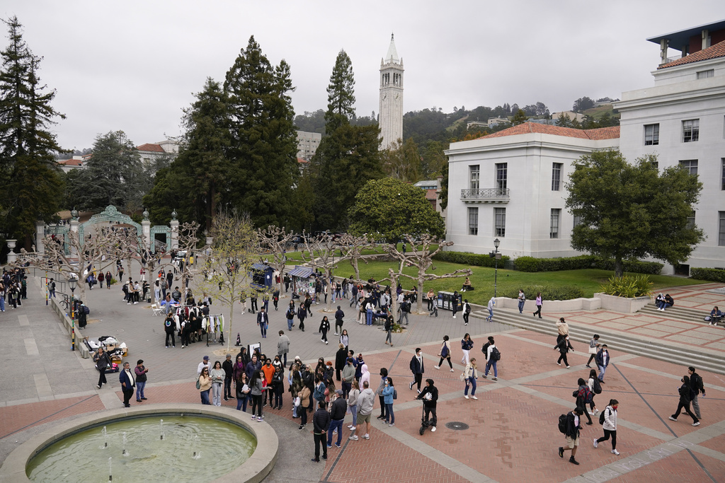 FILE - Students make their way through Sproul Plaza on the University of California, Berkeley, campus Tuesday, March 29, 2022, in Berkeley, Calif. Leaders of the University of California, Berkeley, denounced a protest incited Monday, Feb. 26, 2024, against an event organized by Jewish students that forced police to evacuate attendees and a speaker from Israel for their safety. (AP Photo/Eric Risberg, File)