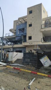 A construction worker in a carpentry workshop in Kiryat Shmona was killed after the building suffered a direct rocket hit. Rescue workers pulled his lifeless body from the burning building and began searching for other possible victims.