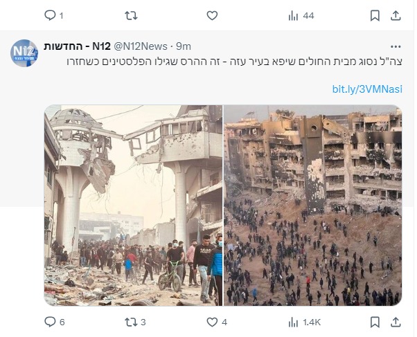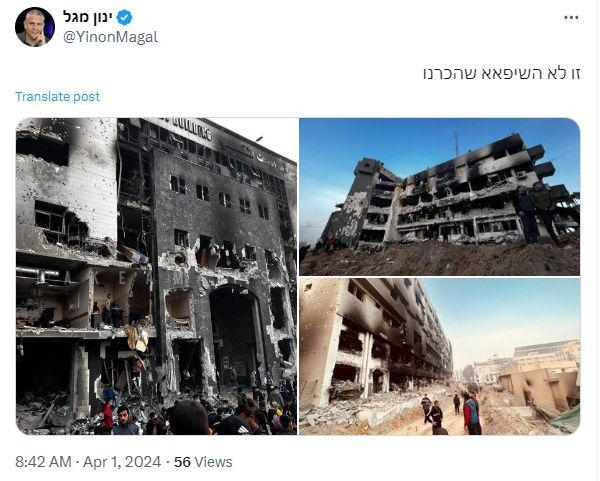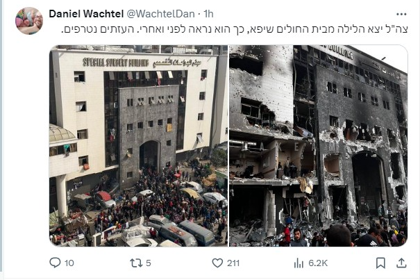 “No longer a hospital”… Ha! it was always a hamas terror base as we saw in all those pictures with the famous unwra building and tunnels… it was never really a hospital just a cover up.