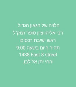 The levaya is taking place on Monday at 9 a.m. in Flatbush at 1438 East 8th Street. After the levaya, his body will be flown to Israel where another levaya will take place.