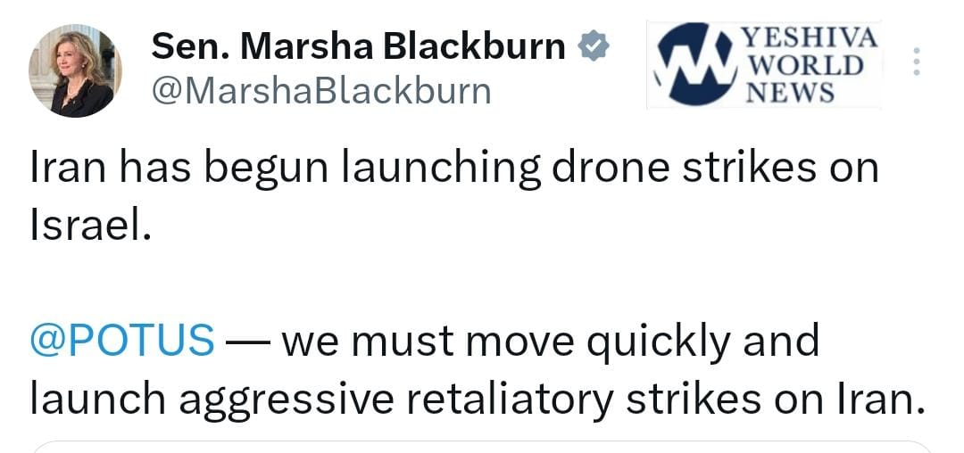 The idea that the USA should strike Iran is insane. Blackburn is a smart lady and knows better than that. The USA should stand behind whatever Israel decides to do, but it has not been attacked so there is no call for it to do anything.