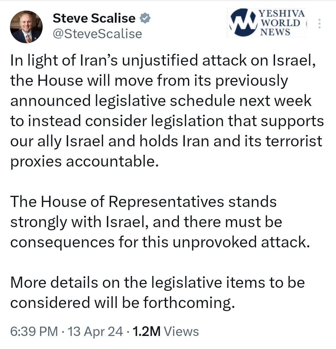 “In light of Iran’s unjustified attack on Israel, the House will move from its previously announced legislative schedule next week to instead consider legislation that supports our ally Israel and holds Iran and its terrorist proxies accountable,” Scalise said.
