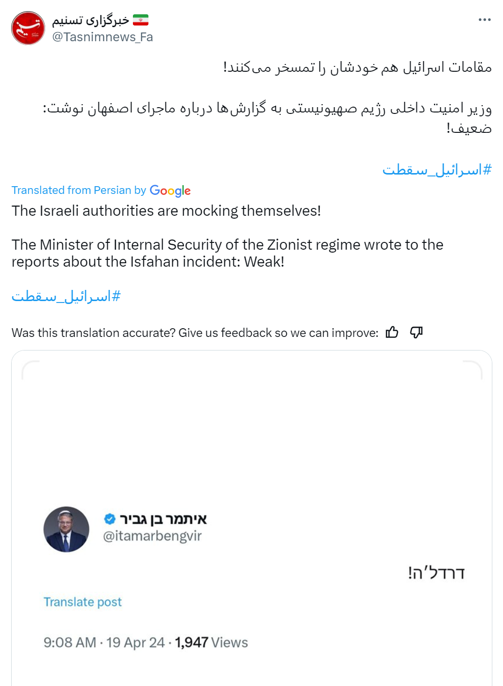 “The Minister of Internal Security of the Zionist regime wrote to the reports about the Isfahan incident: Weak! The Israeli authorities are mocking themselves!” Tasnim tweeted.
