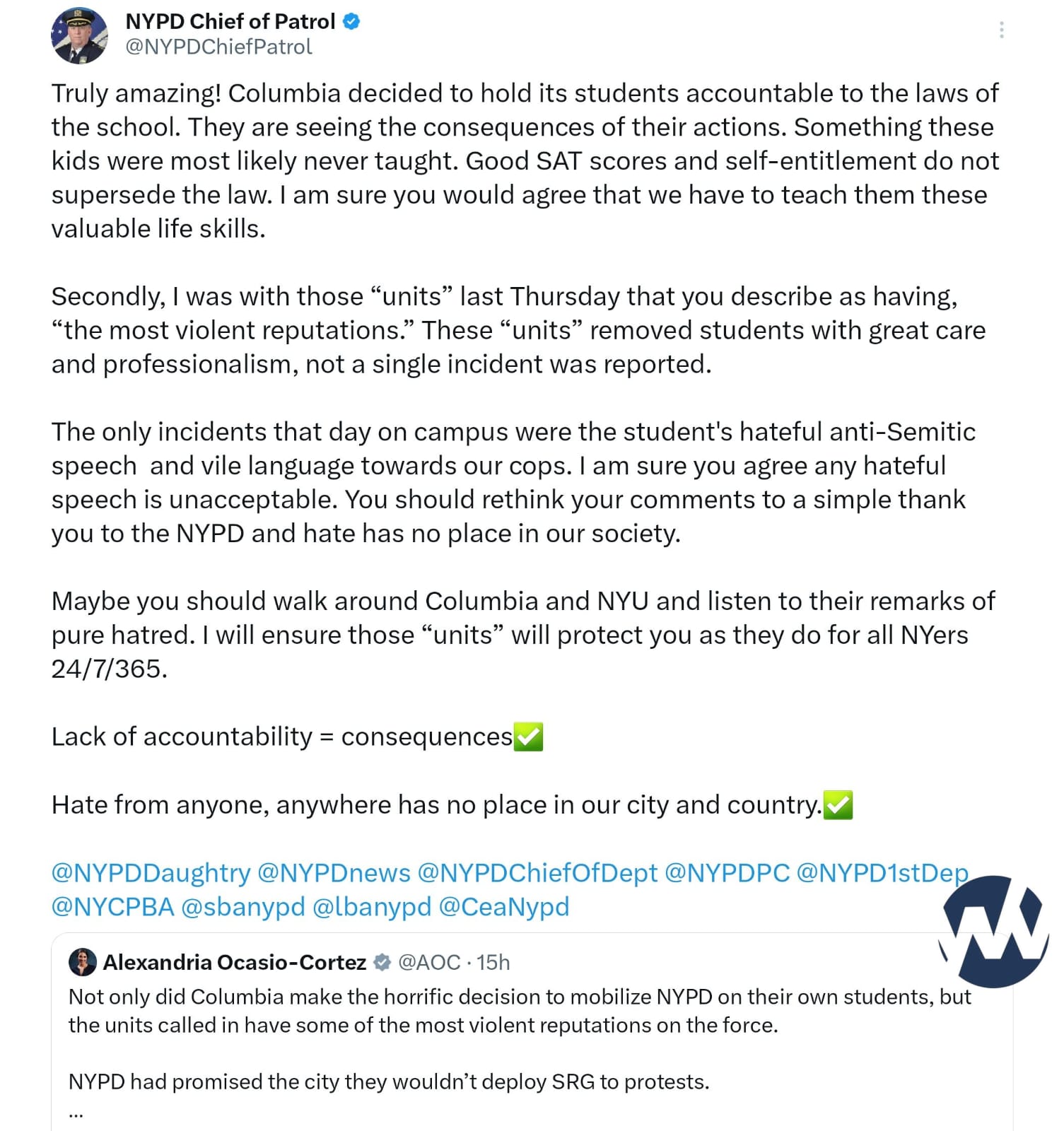 The NYPD Chief of Patrol slammed socialist Congresswoman Alexandria Ocasio-Cortez (AOC) after she voiced criticism against Columbia University for its decision to deploy New York City police officers to manage the violent Pro-Hamas anti-semitic demonstrators.