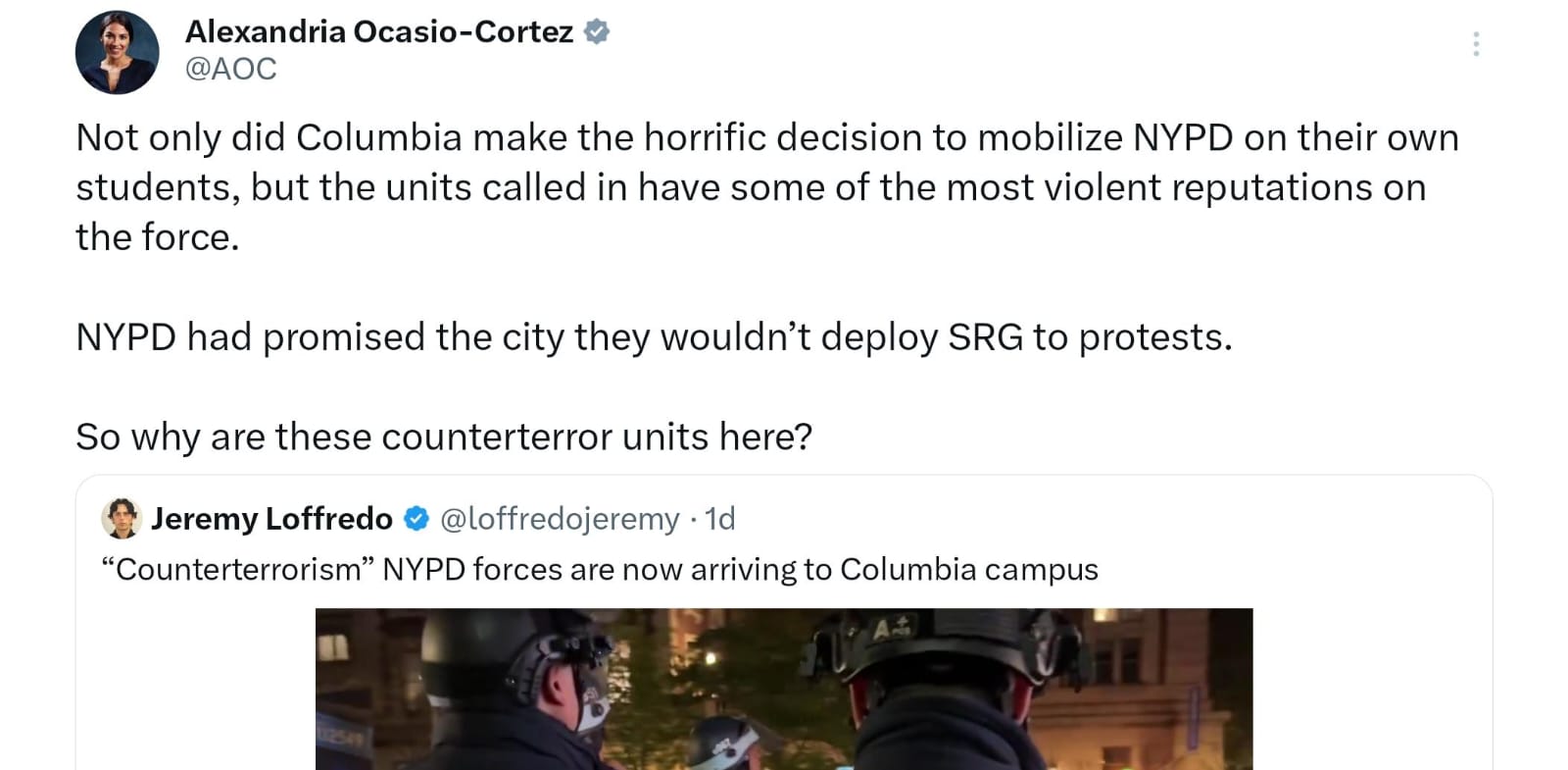 Ocasio-Cortez defended the protesters, who have faced widespread bipartisan criticism in recent days. The New York Democrat condemned the university’s decision to involve law enforcement, particularly taking issue with the deployment of the New York Police Department’s Strategic Response Group.