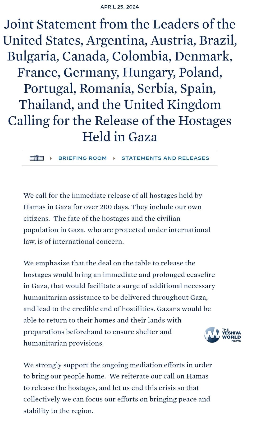 President Joe Biden spearheaded a joint declaration from the leaders of 18 nations, demanding the immediate release of their citizens held hostage by Hamas in Gaza. The statement saw participation from Argentina, Austria, Brazil, Bulgaria, Canada, Colombia, Denmark, France, Germany, Hungary, Poland, Portugal, Romania, Serbia, Spain, Thailand, and the United Kingdom. Notably, Israel was not part of this statement, as the focus was on amassing international backing for the initiative.