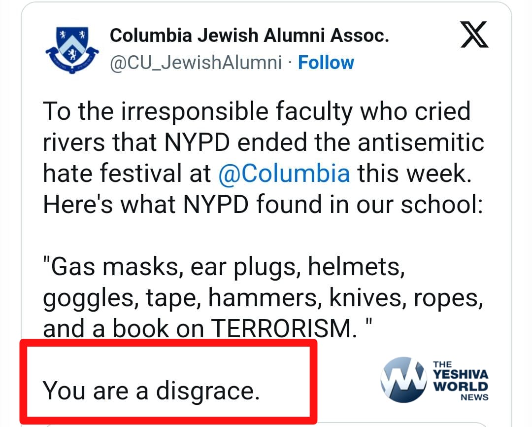 The Columbia Jewish Alumni Association responded to the NYPD’s post, criticizing university staff who had spoken out against the police dispersal of the anti-Israel encampment. “You are a disgrace,” the group said.