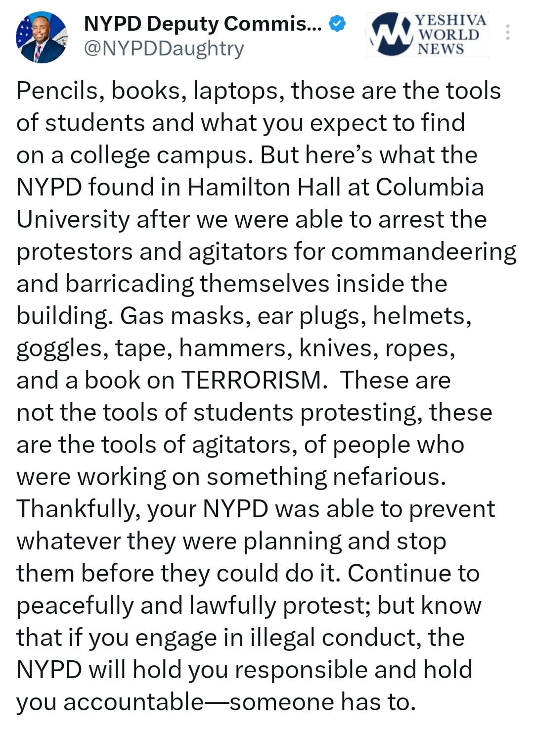 NYPD Deputy Commissioner Kaz Daughtry shared the photos on social media, writing, “These are not the tools of students protesting, these are the tools of agitators, of people who were working on something nefarious.”
